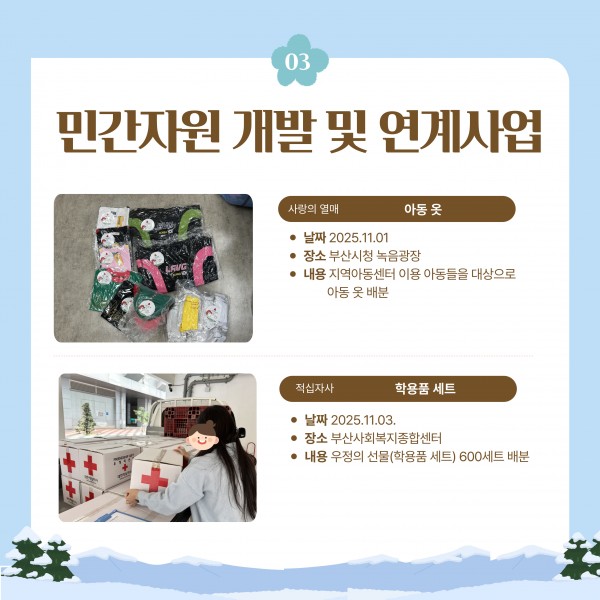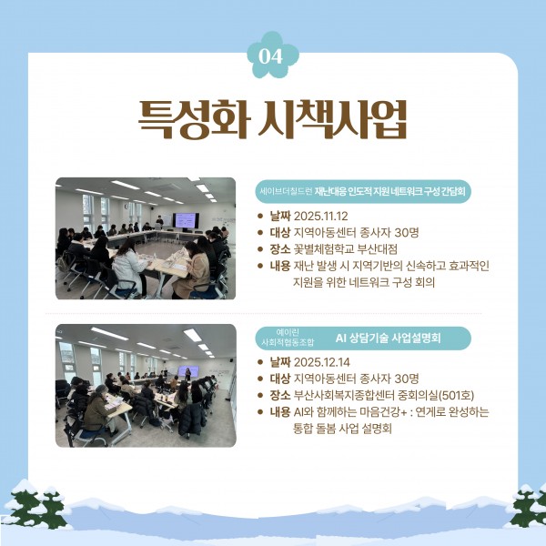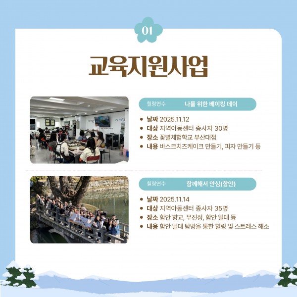 [지원단운영지원사업] 2025년 지역아동센터부산지원단 소식지(4호) 페이지 정보 작성자 부산지원단 작성일26-01-19 10:21 조회5회 댓글0건 관련링크 다음글 목록 본문 안녕하세요! 지역아동센터 부산지원단입니다! 부산지원단의 4분기 소식 전해드립니다.205년도 지역아동센터와 종사자들, 이용 아동들과 함께 할 수 있어 뜻깊은 시간이 되었습니다!2026년도 함께하는 부산지원단이 되겠습니다! 더 자세한 사항은 부산지원단 인스타그램(@bsicare)을 통해 확인하실 수 있습니다. 감사합니다:) 댓글목록 등록된 댓글이 없습니다. 다음글 목록