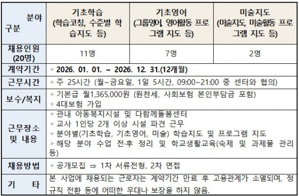 [해운대구] 2026년도 아동복지교사 지원사업 아동복지교사(기간제 근로자) 채용공고 페이지 정보 작성자 부산지원단 작성일25-11-10 10:24 조회768회 댓글0건 첨부파일 공고문안 1.hwp (71.0K) 2026년 아동복지교사 참여 신청서식.hwp (77.0K) 관련링크 이전글 다음글 목록 본문 안녕하세요. 지역아동센터부산지원단입니다. 아동복지교사 지원사업은 아동의 건전한 성장과 발달을 지원하고, 지역사회 일자리 창출을 통한 아동복지 서비스 인력을 양성하는 사업입니다. 2026년 아동복지교사 기본분야(기초학습, 영어, 미술지도)에 참여할 인재를 모집 및 채용하과 아래와 같이 공고하오니, 많은 관심바랍니다. 1. 채용개요 *이 외 사항은 해운대구 기간제 근로자 관리규정, 2025년 아동복지교사 지원사업 안내 지침에 따름. 2, 채용분야 3. 채용일정 댓글목록 등록된 댓글이 없습니다. 이전글 다음글 목록