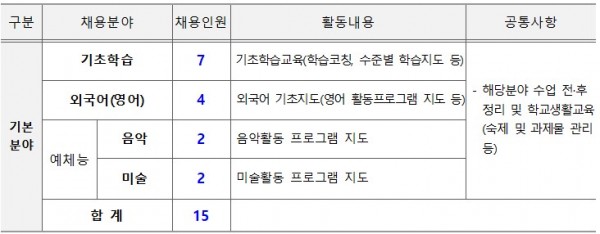 [사상구] 2026년 아동복지교사(기간제 근로자) 채용 공고 페이지 정보 작성자 부산지원단 작성일25-11-18 09:47 조회683회 댓글0건 첨부파일 2026년 사상구 아동복지교사기간제근로자 채용공고문.hwp (163.5K) 관련링크 이전글 다음글 목록 본문 안녕하세요. 지역아동센터부산지원단입니다. 사상구에서는 2026년 아동복지교사(기간제 근로자)를 채용하고 있습니다. 이에 아래와 같이 안내해드리오니 많은 관심바랍니다. 가. 채용개요 1) 근무기간 : 2026. 1. 1. ~ 2026. 12. 31. (12개월) 2) 채용인원 : 기본분야 15명 3) 근무내용 : 분야별(기초학습, 영어, 음악, 미술) 학습 및 프로그램 지도, 해당분야 수업 전후 정리 및 학교생활교육(숙제 및 과제물 관리 등) 나. 채용방법 및 일정 댓글목록 등록된 댓글이 없습니다. 이전글 다음글 목록