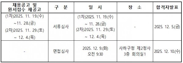 [사하구] 2026년 아동복지교사(기간제 근로자) 채용 재공고 페이지 정보 작성자 부산지원단 작성일25-12-01 09:35 조회315회 댓글0건 첨부파일 2026년 아동복지교사 지원사업 참여 신청서 1부.hwp (50.5K) 2026년 아동복지교사 채용 공고문재공고.hwp (137.5K) 관련링크 이전글 다음글 목록 본문 안녕하세요! 지역아동센터부산지원단입니다. 사하구에서는 아동의 건전한 성장과 발달을 지원하고 지역사회 일자리 창출을 통해 아동복지 서비스 인력을 양성하는 사업을 진행하고 있습니다. 이에 2026년 아동복지교사(기간제 근로자)를 아래와 같이 채용하오니 많은 관심바랍니다. 1. 채용개요 가. 근무기간 : 2026. 1. 1.~2026. 12. 31.(12개월) 나. 채용인원 : 16명 다. 근 무 지 : 사하구 내 지역아동센터(2개소 이상 연계 배치) 라. 채용분야 2. 채용일정 댓글목록 등록된 댓글이 없습니다. 이전글 다음글 목록