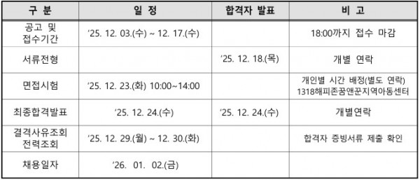 [해운대구]1318해피존꿈앤꿈지역아동센터 생활복지사 채용 공고 페이지 정보 작성자 부산지원단 작성일25-12-03 15:51 조회283회 댓글0건 첨부파일 1318해피존꿈앤꾼지역아동센터 생활복지 채용 공고문.pdf (197.9K) [서식]1318해피존꿈앤꾼지역아동센터 응시자 제출서류.hwp (47.0K) 관련링크 이전글 다음글 목록 본문 안녕하세요! 지역아동센터부산지원단입니다. 해운대구에 소재하고 있는 1318해피존꿈앤꿈지역아동센터에서 함께할 생활복지사를 채용하고 있습니다. 이에 아래와 같이 안내해드리오니 많은 관심바랍니다! 가. 채용인원 : 1명(생활복지사)나. 채용일정 다. 응시원서 접수 및 증빙 서류 제출 1) 접수기간 : 2025.12.03~12.17. 2) 접수방법 : 이메일 접수(dreamer1813@hanmail.net) *이메일 접수만 가능 3) 채용문의 : 1318해피존꿈앤꿈지역아동센터 (051-542-1813) 댓글목록 등록된 댓글이 없습니다. 이전글 다음글 목록