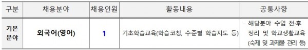 [사상구] 2026년 아동복지교사(기간제 근로자) 추가 채용 공고 페이지 정보 작성자 부산지원단 작성일25-12-11 09:23 조회330회 댓글0건 첨부파일 2026년 사상구 아동복지교사기간제근로자 추가 채용공고문.hwp (79.0K) 관련링크 이전글 다음글 목록 본문 안녕하세요. 지역아동센터부산지원단입니다. 사상구에서는 2026년 아동복지교사(기간제 근로자)를 채용하고 있습니다. 이에 아래와 같이 안내해드리오니 많은 관심바랍니다. 가. 채용개요 1) 근무기간 : 2026. 1. 1. ~ 2026. 12. 31. (12개월) 2) 채용인원 : 기본분야 15명 3) 근무내용 : 분야별(기초학습, 영어, 음악, 미술) 학습 및 프로그램 지도, 해당분야 수업 전후 정리 및 학교생활교육(숙제 및 과제물 관리 등) 나. 채용방법 및 일정 댓글목록 등록된 댓글이 없습니다. 이전글 다음글 목록