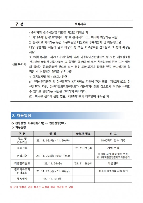 1318해피존꿈앤꾼지역아동센터 종사자 채용공고 페이지 정보 작성자 부산지원단 작성일25-11-06 20:23 조회463회 댓글0건 첨부파일 페이지 원본 1318해피존꿈앤꾼지역아동센터 종사자 채용 공고문.pdf (185.3K) [서식]1318해피존꿈앤꾼지역아동센터 응시자 제출서류.hwp (50.5K) 관련링크 이전글 다음글 목록 본문 댓글목록 등록된 댓글이 없습니다. 이전글 다음글 목록