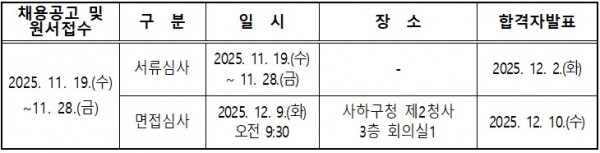 [사하구] 2026년 아동복지교사(기간제근로자) 채용공고 페이지 정보 작성자 부산지원단 작성일25-11-19 17:53 조회575회 댓글0건 첨부파일 2026년 아동복지교사 채용 공고문 2.hwp (69.0K) 2026년 아동복지교사 지원사업 참여 신청서.hwp (99.5K) 관련링크 이전글 다음글 목록 본문 안녕하세요! 지역아동센터부산지원단입니다. 사하구에서는 아동의 건전한 성장과 발달을 지원하고 지역사회 일자리 창출을 통해 아동복지 서비스 인력을 양성하는 사업을 진행하고 있습니다. 이에 2026년 아동복지교사(기간제 근로자)를 아래와 같이 채용하오니 많은 관심바랍니다. 1. 채용개요 가. 근무기간 : 2026. 1. 1.~2026. 12. 31.(12개월) 나. 채용인원 : 16명 다. 근 무 지 : 사하구 내 지역아동센터(2개소 이상 연계 배치) 라. 채용분야 2. 채용일정 댓글목록 등록된 댓글이 없습니다. 이전글 다음글 목록