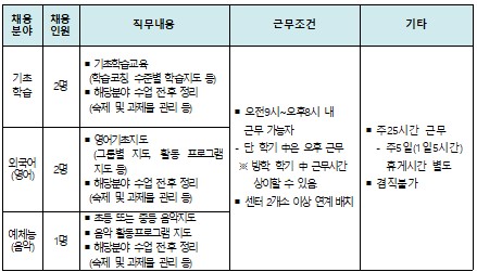 기장군에서는 아동돌봄시설(다함께돌봄센터) 및 아동복지시설(지역아동센터)의 이용아동에게 방과후 돌봄서비스를 지원할 아동ㅂ고지교사를 채용하고자 다음과 같이 안내해드리오니 많은 관심바랍니다.