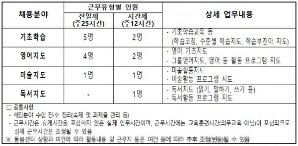 [사하구] 2026년 아동복지교사(기간제 근로자) 채용 재공고 페이지 정보 작성자 부산지원단 작성일25-12-01 09:35 조회313회 댓글0건 첨부파일 2026년 아동복지교사 지원사업 참여 신청서 1부.hwp (50.5K) 2026년 아동복지교사 채용 공고문재공고.hwp (137.5K) 관련링크 이전글 다음글 목록 본문 안녕하세요! 지역아동센터부산지원단입니다. 사하구에서는 아동의 건전한 성장과 발달을 지원하고 지역사회 일자리 창출을 통해 아동복지 서비스 인력을 양성하는 사업을 진행하고 있습니다. 이에 2026년 아동복지교사(기간제 근로자)를 아래와 같이 채용하오니 많은 관심바랍니다. 1. 채용개요 가. 근무기간 : 2026. 1. 1.~2026. 12. 31.(12개월) 나. 채용인원 : 16명 다. 근 무 지 : 사하구 내 지역아동센터(2개소 이상 연계 배치) 라. 채용분야 2. 채용일정 댓글목록 등록된 댓글이 없습니다. 이전글 다음글 목록