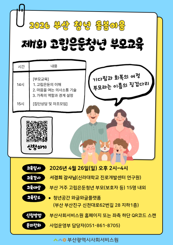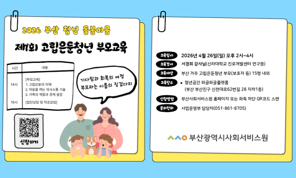 [부산광역시사회서비스원] 2026 부산 청년 돌봄이음 제1회 고립은둔청년 부모교육 실시 안내